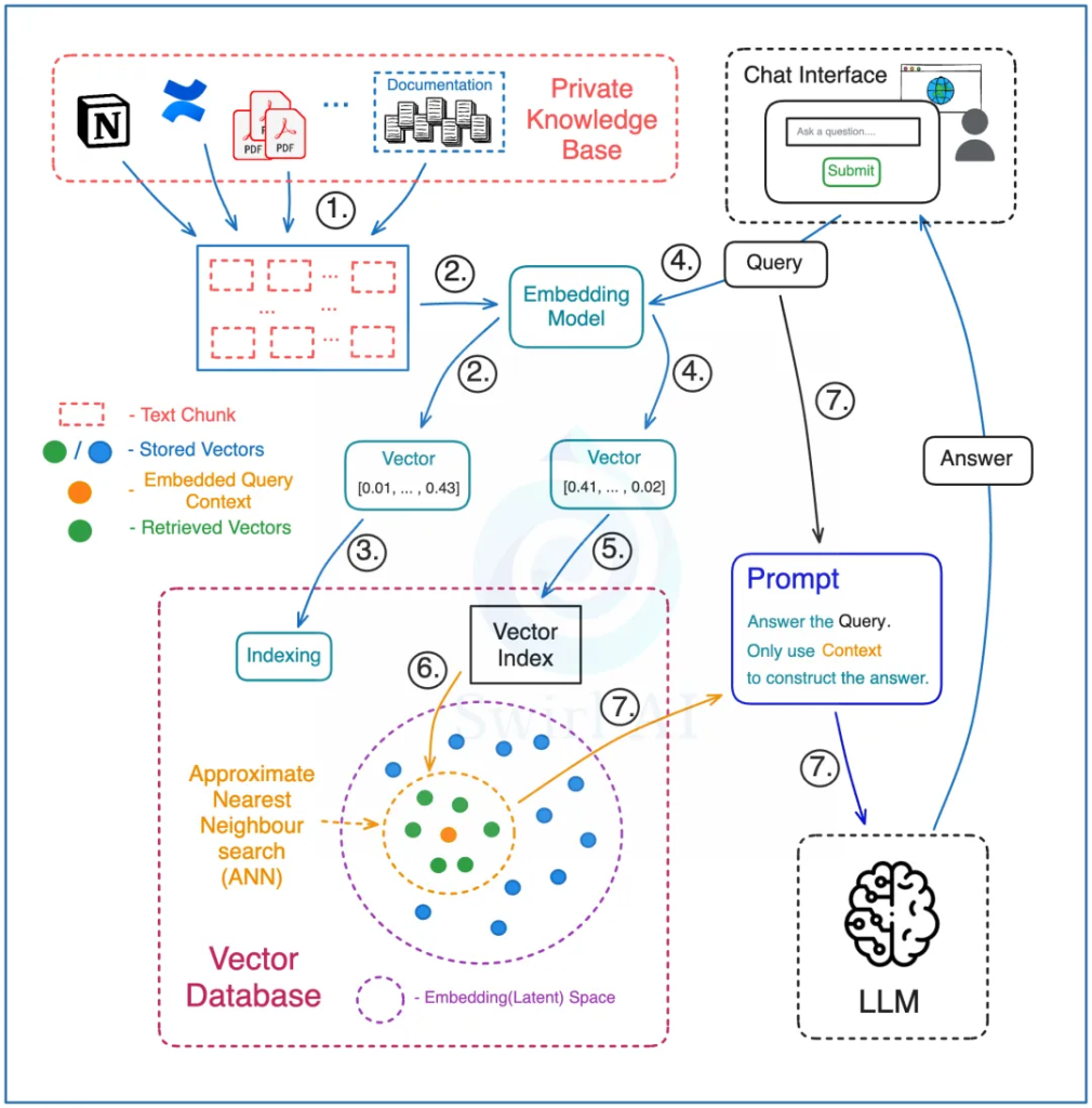 3. The vector database performs a search to find the most similar vectors, then maps them back to their corresponding original text chunks.
